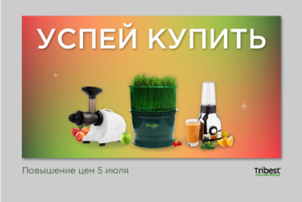 Друзья, грядёт очередное повышение цен на технику Tribest. Как Вы уже наверняка заметили: раз в две недели до 19 июля включительно стоимость аппаратов постоянно повышается. Следующее повышение цен запланировано на 5 июля. Осталось меньше месяца, чтобы определиться с выбором и приобрести понравившийся аппарат по всё ещё хорошей цене. Также Вы всегда можете забронировать понравившийся товар на 7 дней по текущей стоимости, а оплатить его уже при получении. Рекомендуем Вам не откладывать покупку, поскольку через какое-то время аппарата уже может не быть в наличии или его цена будет выше на несколько тысяч рублей.