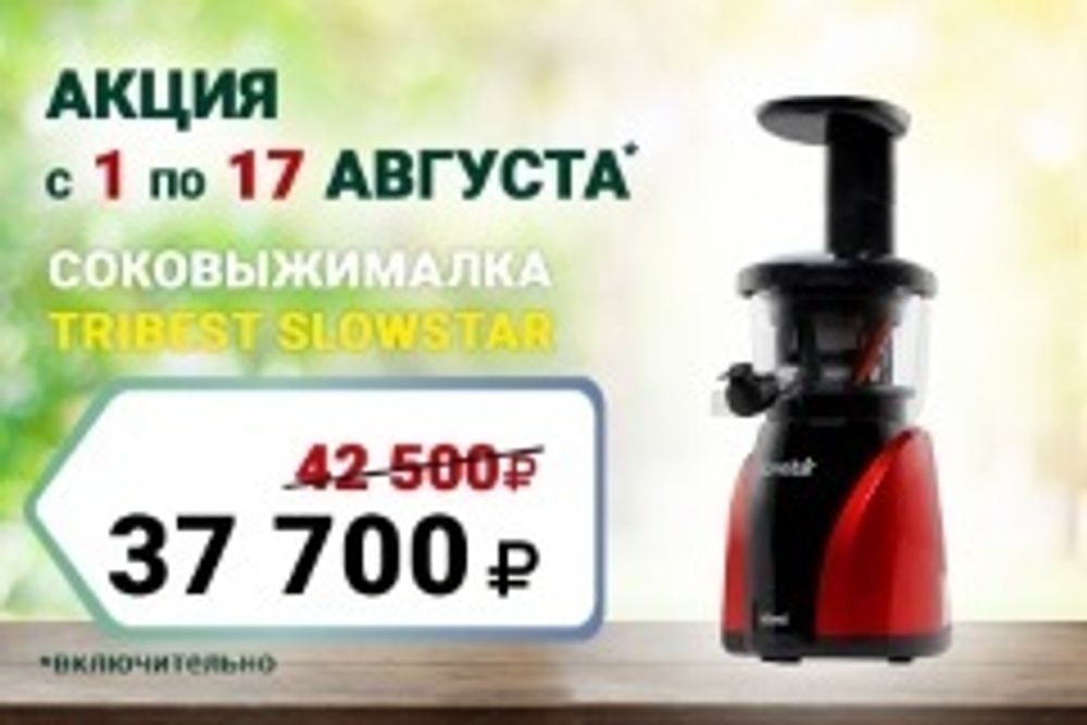 В рейтинге лучших соковыжималок Tribest Slowstar занимает лидирующие позиции. Гарантия на неё составляет 10 лет – это в разы больше, чем у других соковыжималок. Благодаря мощному двигателю в ней можно отжать килограмм даже самых твёрдых продуктов менее чем за две минуты. Успейте насладиться всеми дарами лета и заготовить их на долгую зиму с помощью вертикальной соковыжималки Tribest Slowstar. До 17 августа скидка на соковыжималку составит 11%.