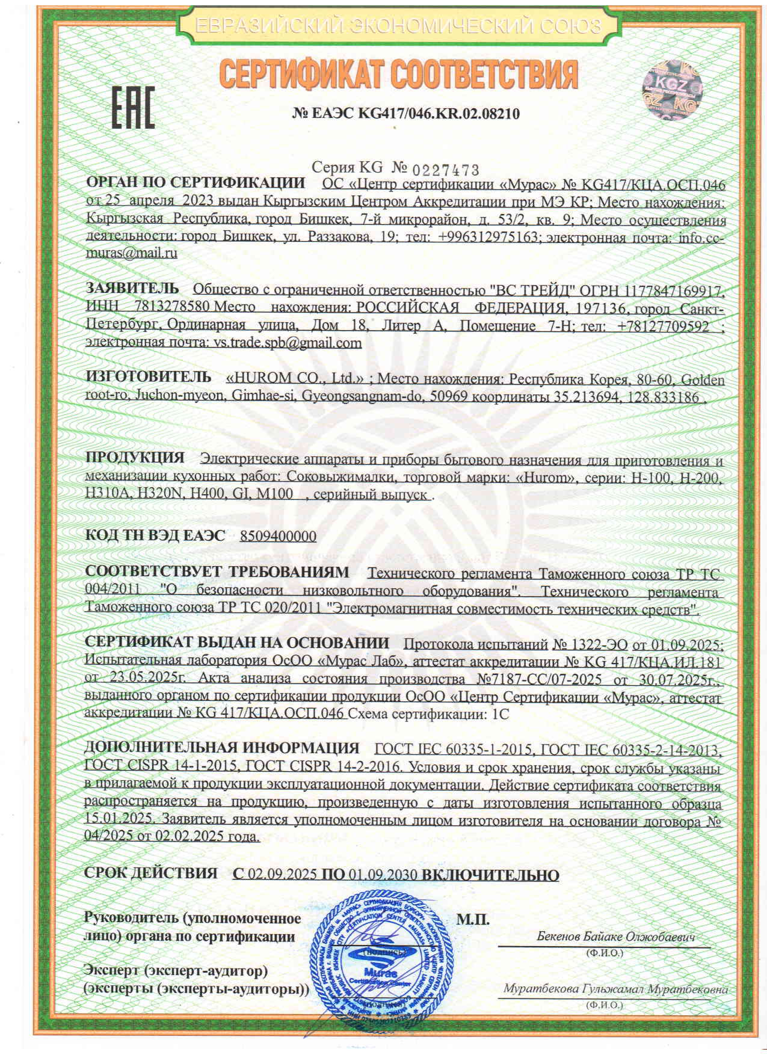 Сертификаты EAC на соковыжималки Hurom