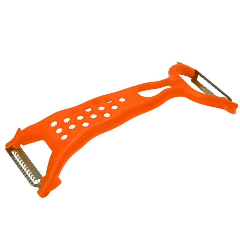 Одним из таких кухонных инструментов является овощечистка двусторонняя (магический нож). Она служит для чистки и нарезания фруктов, овощей; используется в качестве терки. Прочные тонкие лезвия данной овощечистки выполнены из нержавеющей стали, которая применяется для изготовления обычных ножей. Первая насадка приспособления имеет две режущие части. Лезвие снимает тонкий пласт продукта, а острые зубья разрезают его ровными длинными полосочками. Эту часть ножа можно использовать, например, для нарезания моркови, свеклы, капусты, чтобы приготовить борщ или овощной салат.