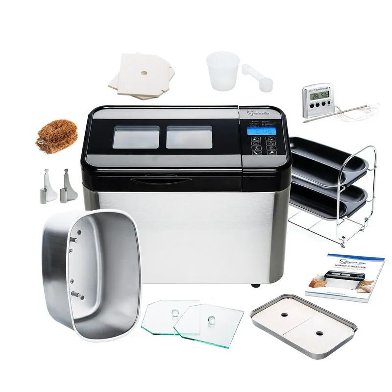 Модель Exclusive имеет в своей комплектации форму и лопатки из нержавеющей стали, стеклянные крышки для лучшей консистенции хлеба и сохранения энергии, цифровой мультитермометр, форму для выпечки багетов, установка для изготовления закваски и мерную кружку.