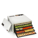Дегидратор Excalibur Lux 5SS имеет 5 лотков из пищевой нержавеющей стали 304 марки с горизонтальным обдувом, таймер на 26 часов, и съемную переднюю дверцу.