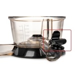 Крышка-воронка предназначена для загрузки продуктов в отжимную корзину соковыжималки. Оснащена двумя загрузочными отверстиями для загрузки продуктов разной формы: верхнее отверстие подходит для вертикального погружения длинных и узких овощей, боковое используется для мелких или нарезанных кусочками ингредиентов. Загрузочная воронка имеет наклонную форму, благодаря чему продукты самостоятельно скатываются в отжимную корзину.
