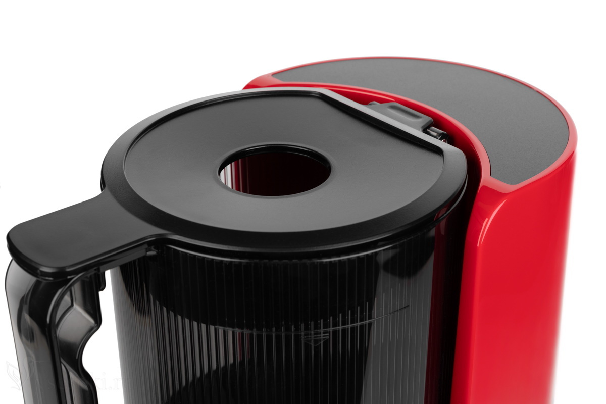 Если Вам нужно добавить ингредиенты в процессе отжима, не нужно останавливать соковыжималку – специально для этого в крышке корзины есть небольшое загрузочное отверстие (45 × 45 мм). Случайно открыть крышку во время работы не получится: она крепится к ручке прочным фиксатором. Но её можно снять, чтобы удобнее было мыть отжимную корзину.