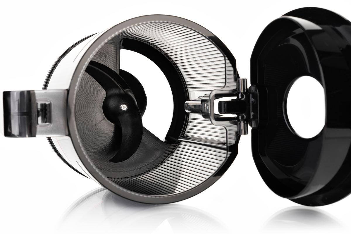 Эта соковыжималка идеальна для ежедневного использования – её не надо отмывать после сока, достаточно сполоснуть несколько секунд. Вместо сетки с мелкими ячейками, в которой застревают кусочки мякоти, у Hurom H-200 решётка с длинными узкими отверстиями – что и делает приготовление сока таким комфортным. Ещё у Н-200 есть предварительный измельчитель – не нужно нарезать продукты, просто закиньте их в соковыжималку целиком, закройте крышку, нажмите кнопку и подождите минуту-другую. Всё, ваш свежевыжатый сок готов!