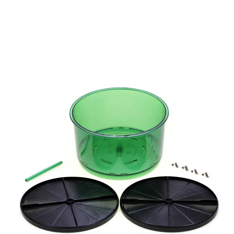 Спраутер Tribest Freshlife FL-3000 — весьма простой по устройству прибор, и производитель этого не скрывает. В сборке он представляет собой высокую, в несколько этажей, кастрюлю с разбрызгивателем. Цвет прибора — темно-зеленый, пластмасса контейнеров для проращивания и крышки прозрачная, в отличие от материала нижнего этажа — поддона для воды. Это вполне логично: верхние части прибора должны быть светопроницаемыми. Никакого штатного освещения внутри спраутера нет.