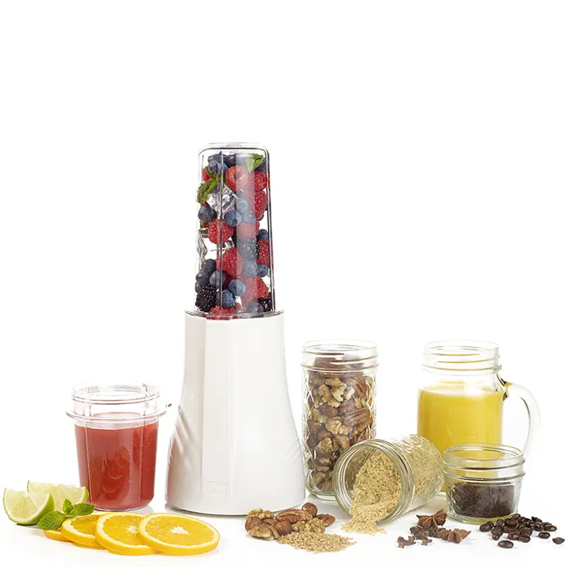 PB-350 оснащён 200-ваттным мотором, благодаря которому легко приготовить смузи, коктейли, соусы или крем-супы. В комплекте с блендером поставляется второй блок ножей для измельчения, который позволяет перемалывать сухие продукты. Все ёмкости имеют соответствующие крышки для хранения, а к тритановым стаканам прилагается дополнительная походная крышка. Тритан, из которого изготовлены чаши – это безопасный материал, в котором не содержится токсичный бисфенол А.